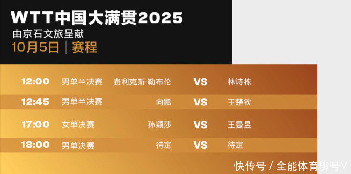 北京时间10月5日音书,2025年WTT中国大满贯插足终末一天,须眉单打半决赛和决赛联贯献艺,CCTV5全程直播。冠军战,宇宙第一王楚钦迎战法国“眼镜侠”费利克斯-勒布伦(18:00)。刚刚收敛的2场半决赛,王楚钦、勒布伦以4-2、4-3的比分淘汰了林诗栋、向鹏。