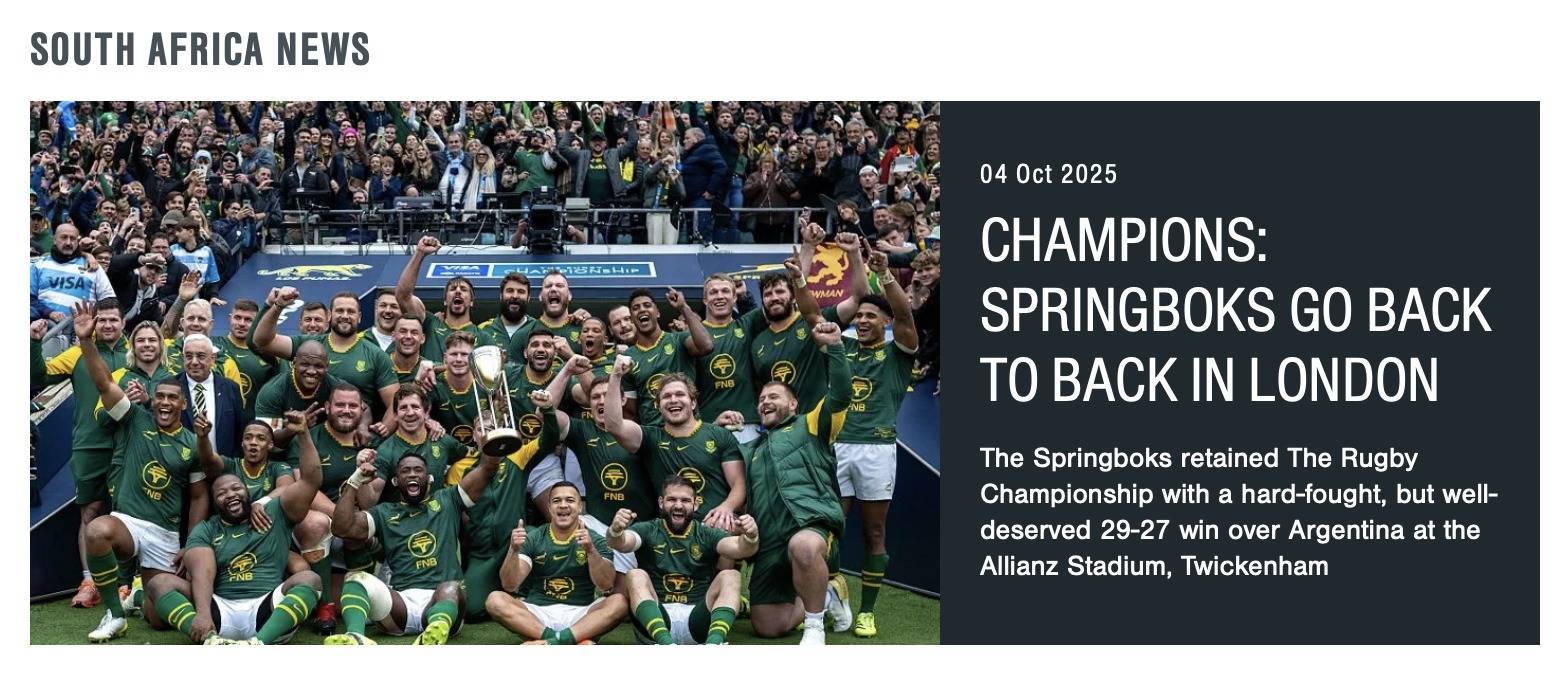 新华社约翰内斯堡10月4日电(记者蒋国鹏 白舸)在4日举行的2025年橄榄球锦标赛第六轮赛事中,南非跳羚队在伦敦以29:27的比分险胜阿根廷好意思洲狮队,在积分榜以“小分上风”力压新西兰全黑队,得胜卫冕。