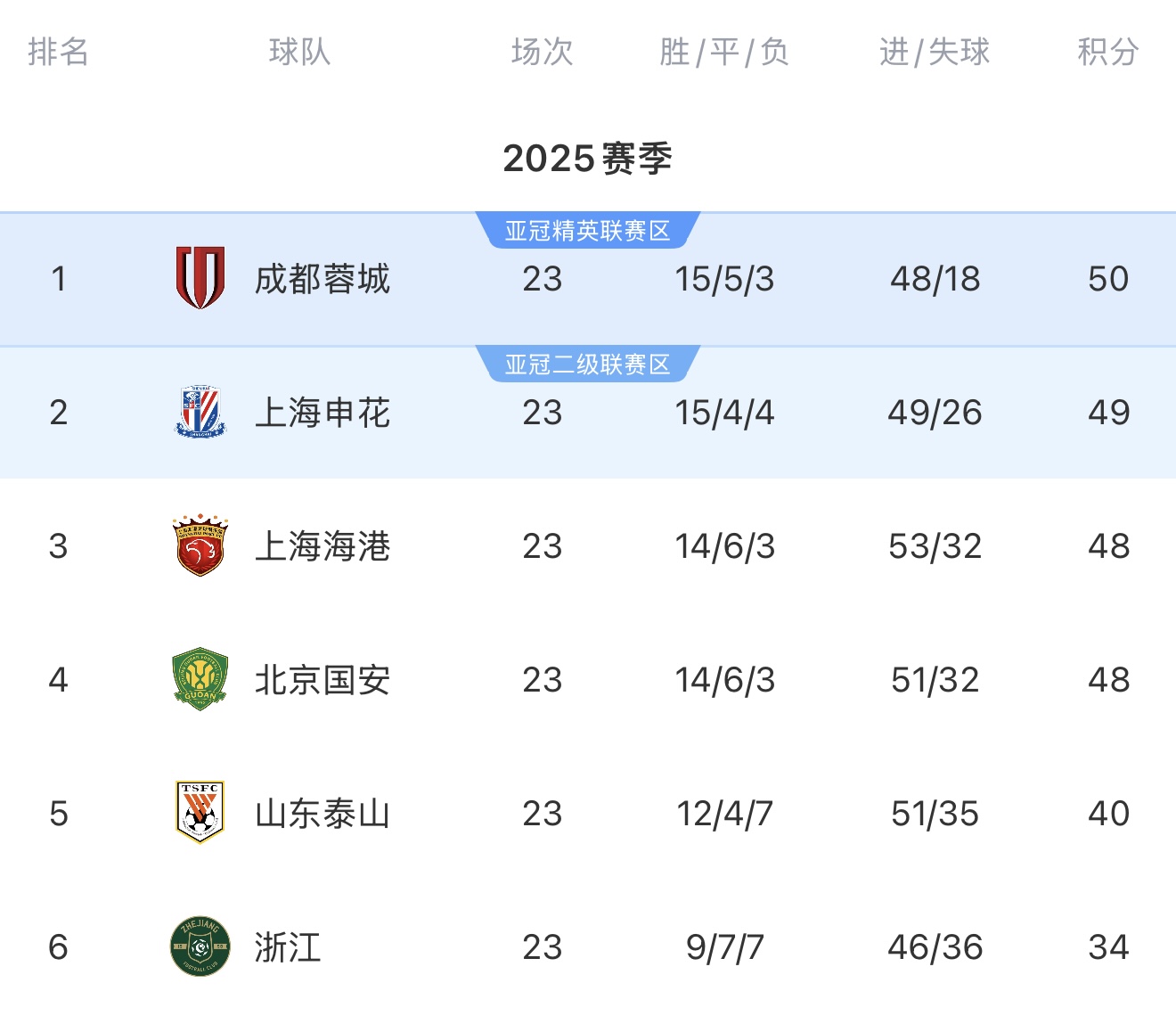 在此前的22轮联赛适度后,中超的争冠神色发生了广泛变化。 申花队以49分领跑积分榜,国安和海港队同积48分,前者凭借净胜球上风排行第二。成王人蓉城队则以47分紧随后来,前四名之间仅有2分之差。 这种最小拒绝唯有2分的争冠集团神色,在中超联赛历史上还从未出现过。