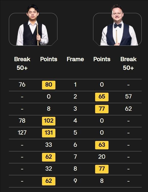 在本场比赛中,袁想俊打出一杆破百(127)和两杆50+(76、78),墨菲打出两杆50+(57、62)。