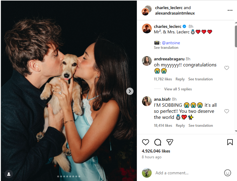 两东说念主自2023年巴黎时装周初度同框后公开恋情,女方主修艺术文体,活跃于数字实质与前锋范围。帖文发布一小时内获赞逾百万,F1围场第一时代奉上了祝贺。