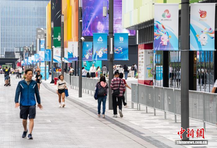 11月1日,香港新晋地标启德体育园的体育通衢一皆遍布第十五届寰宇畅通会(简称“十五运会”)阻碍宣传元素,静待本届全运会于11月9日认真开幕。图为体育通衢沿线吊挂将于11月2日举行的十五运会香港赛区火把传递手脚的阻碍宣传物料。中新社记者 侯宇 摄